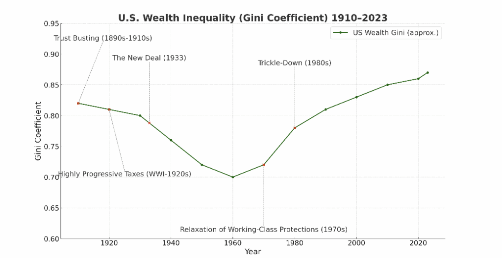 From the 1980s onward, “trickle-down economics” became dominant: big tax cuts for corporations and the rich, deregulation, and a belief that growth at the top would benefit everyone. In practice, much of the benefit stayed with the wealthy. Inequality rose sharply.