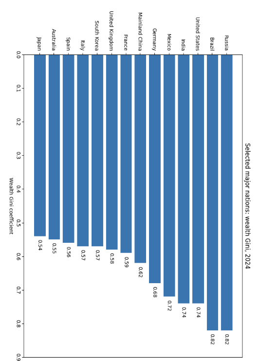 I used the 2024 wealth Gini coefficients reported in the UBS Global Wealth Report 2025. In that ranking, among these selected major countries, Japan is lowest at 0.54, while Brazil and Russia are highest at 0.82; the United States and India are both at 0.74. UBS notes that, in its 2024 sample, wealth Gini values range from 0.38 in Slovakia to 0.82 in Brazil, with higher values meaning greater wealth inequality. — ChatGPT